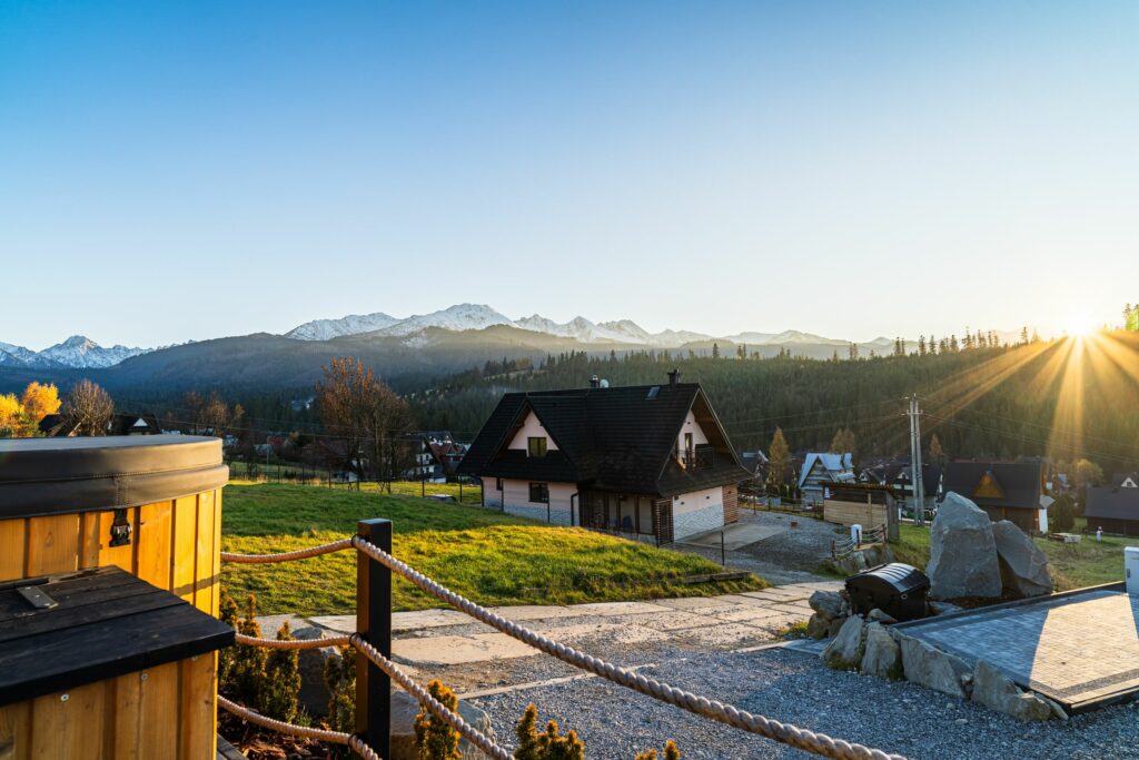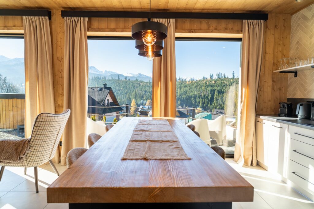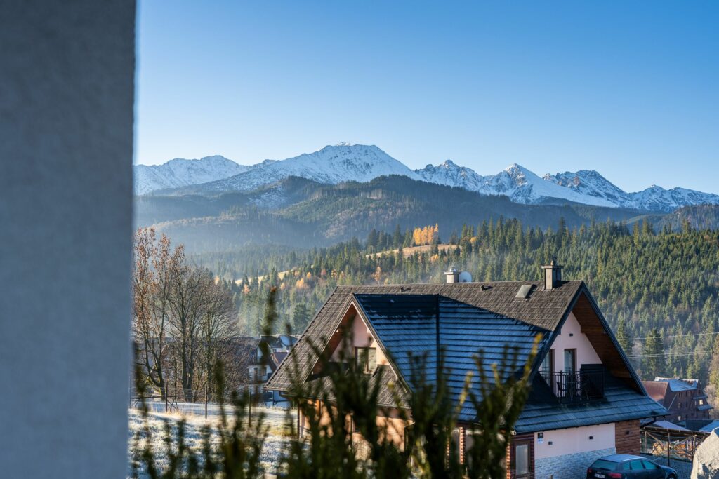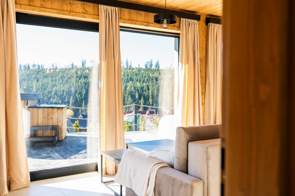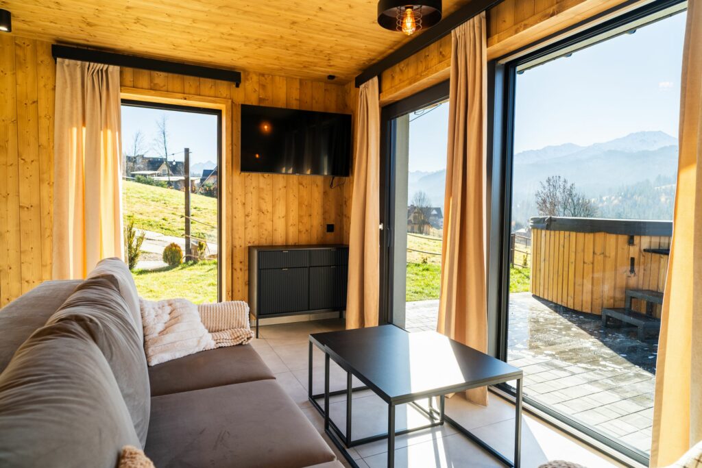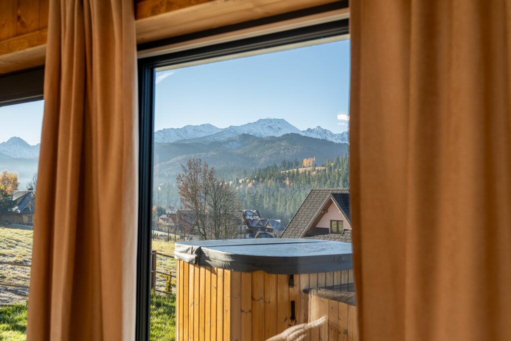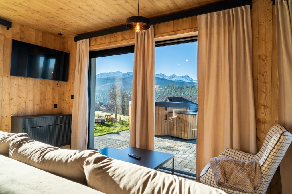 Dzięki panoramicznym oknom można podziwiać majestatyczne szczyty Tatr nawet z wnętrza domku.