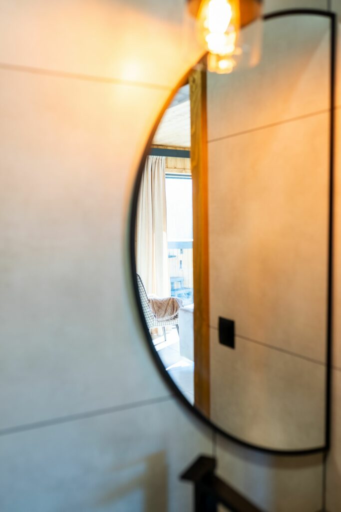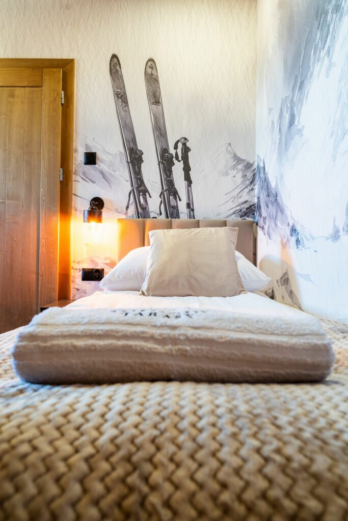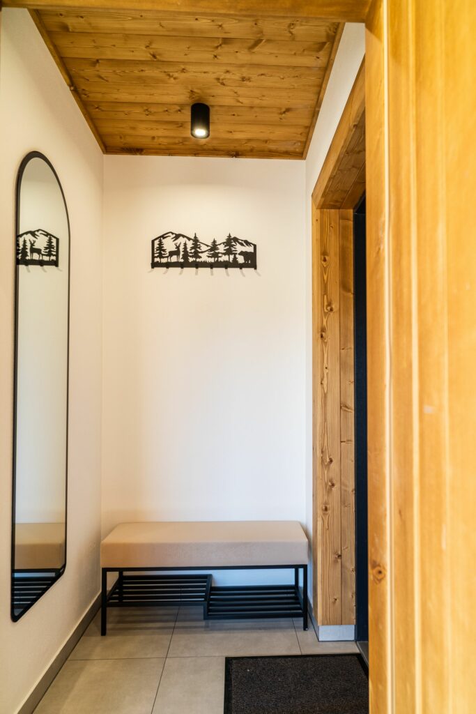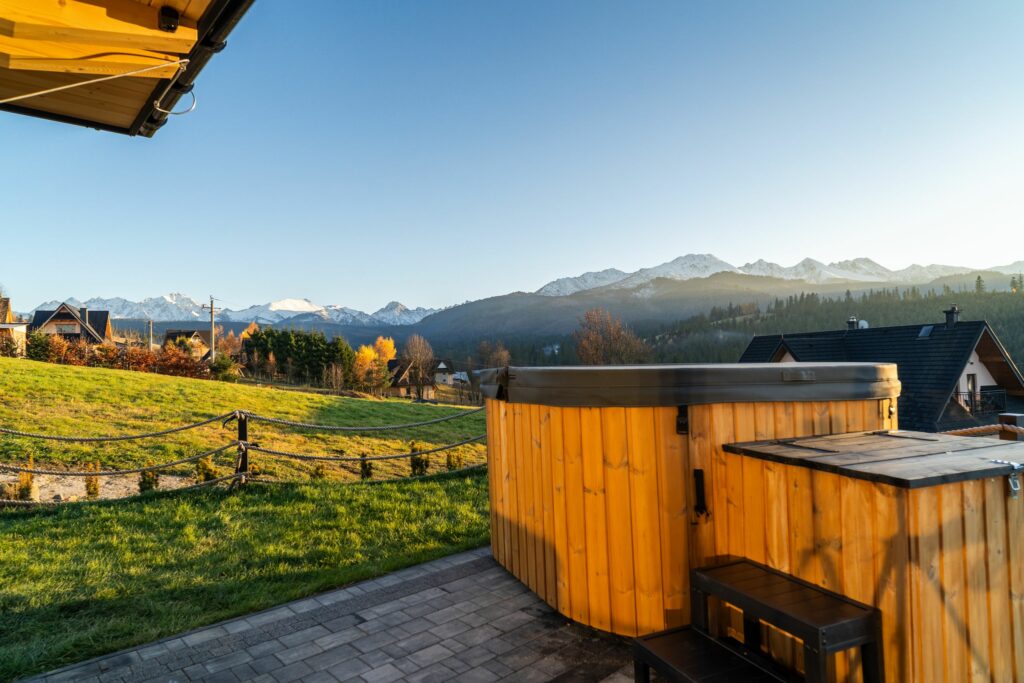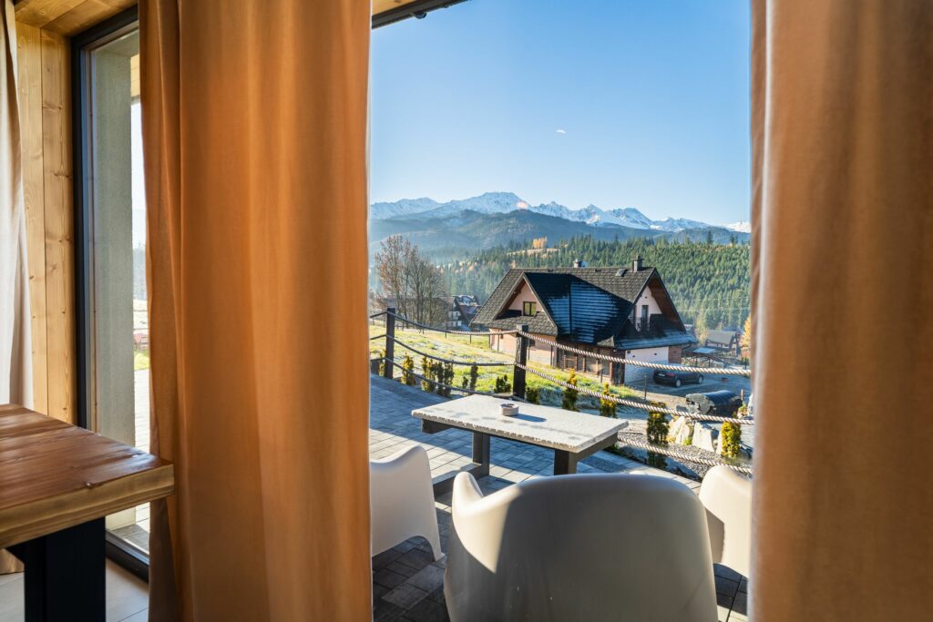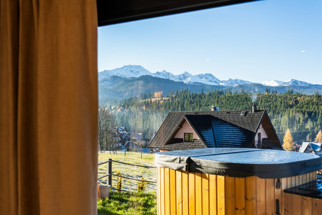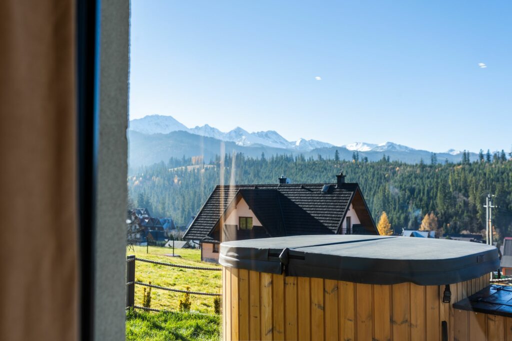 Na zewnątrz czeka prywatny taras z jacuzzi i widokiem na góry – idealne miejsce, by zrelaksować się po dniu pełnym przygód lub podziwiać zachód słońca w górskim klimacie.
