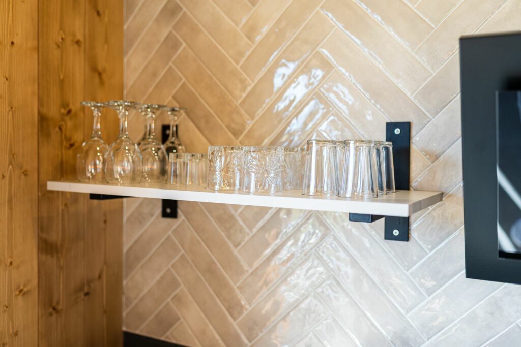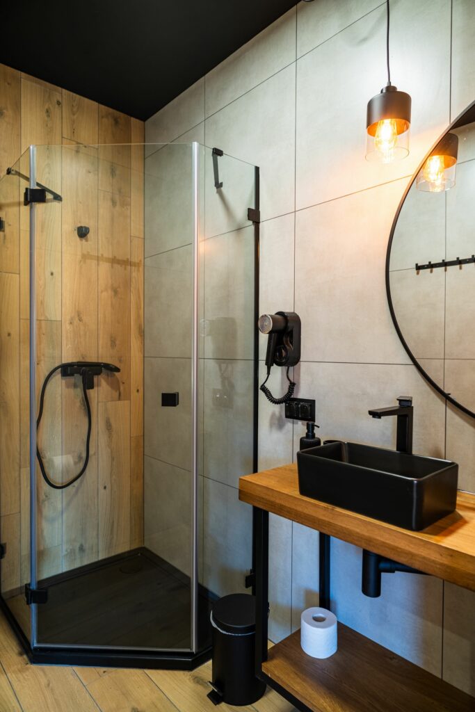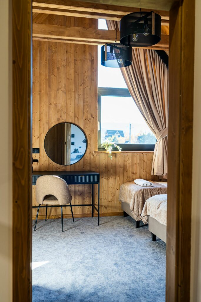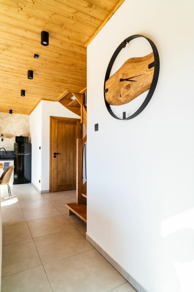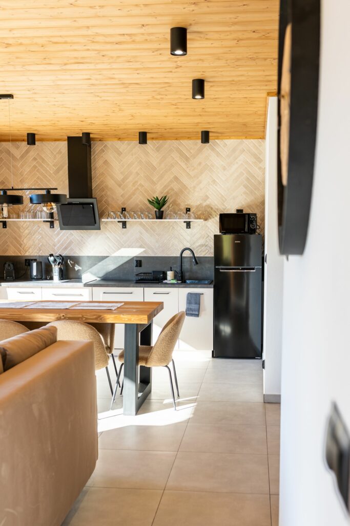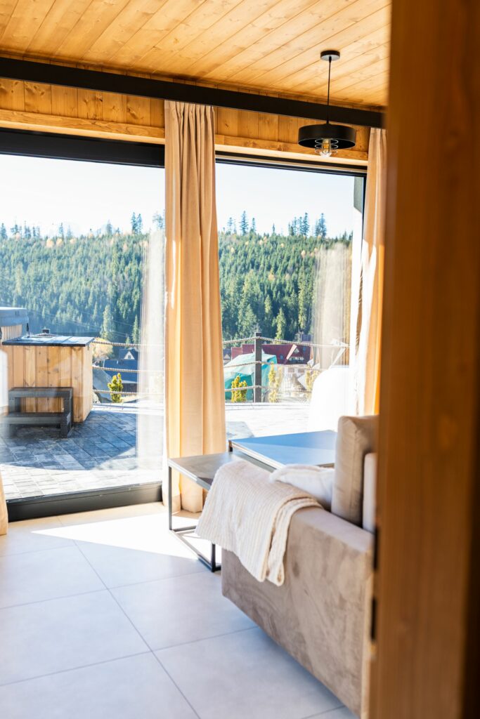 Wnętrze łączy nowoczesny design z ciepłem drewna, tworząc wyjątkowy klimat sprzyjający wypoczynkowi.