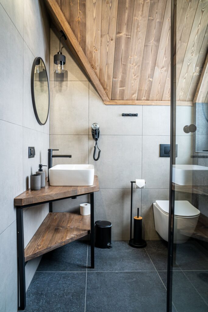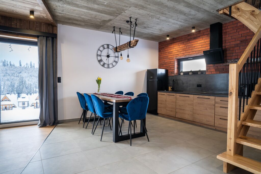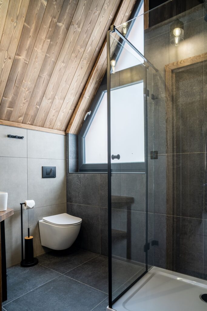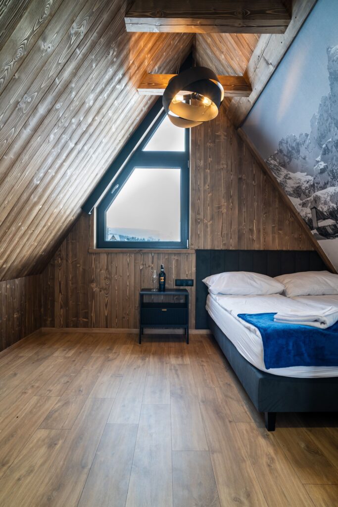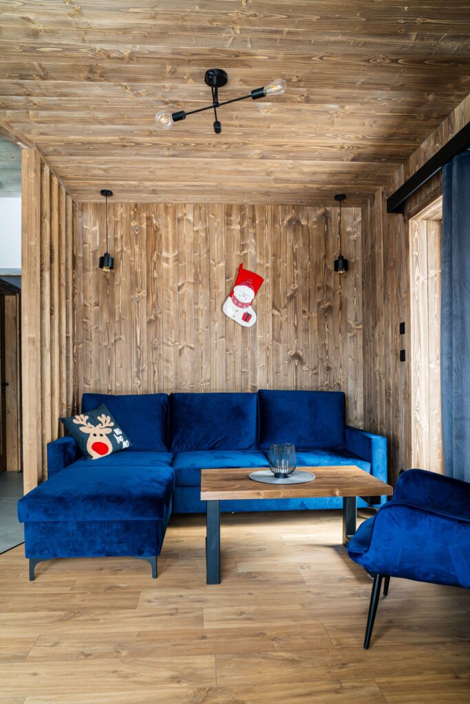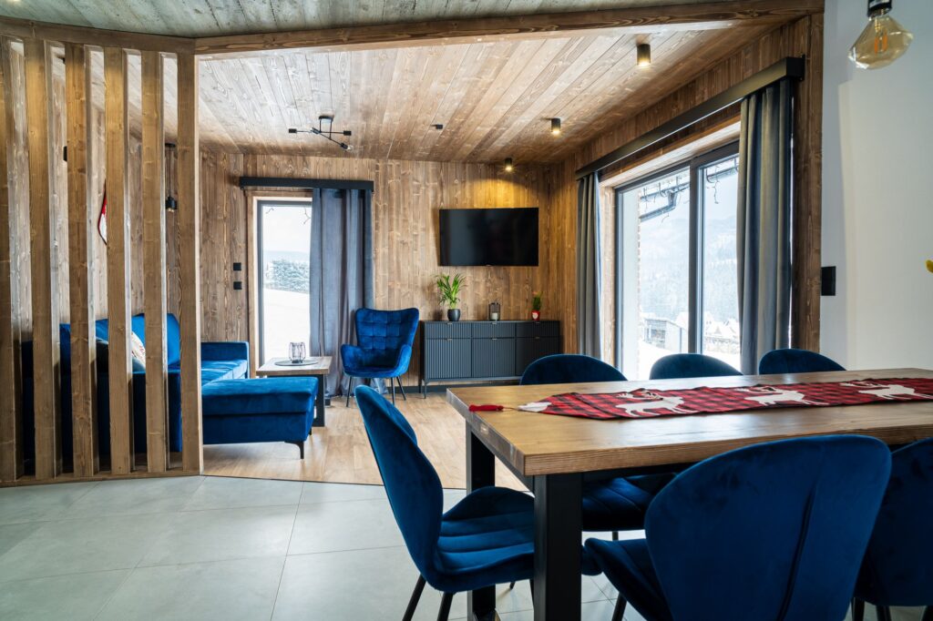Salon z Tarasem: Wejście do domku prowadzi do salonu z wygodną sofą dwuosobową i telewizorem. Duże okno balkonowe otwiera się na duży taras z widokiem na góry, tworząc doskonałe miejsce do relaksu na świeżym powietrzu.