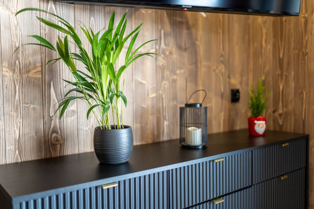 Na zewnątrz czekają na Ciebie prywatna, 6-osobowa sauna sucha oraz przestronne jacuzzi, również na 6 osób, w których w pełni odprężysz się w otoczeniu natury. To idealna przestrzeń, by w gronie bliskich zregenerować siły, cieszyć się chwilą spokoju i zadbać o swoje zdrowie. Sauna i jacuzzi są dostępne wyłącznie dla gości Domku nr 1, gwarantując Ci pełną prywatność i komfort. Pozwól sobie na luksusowy relaks, na który zasługujesz!