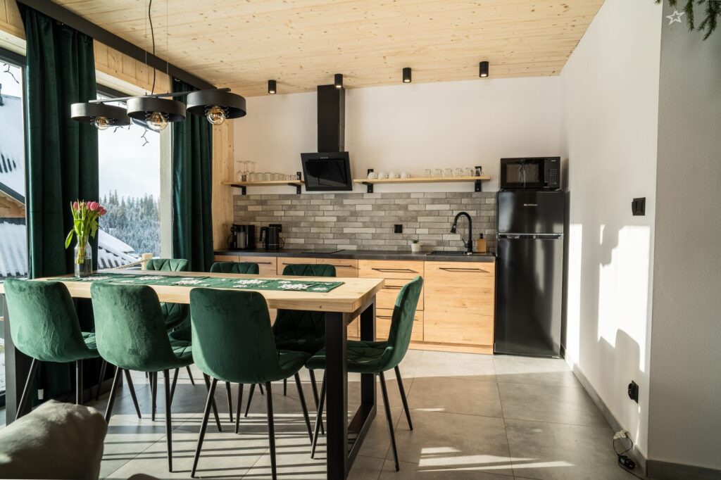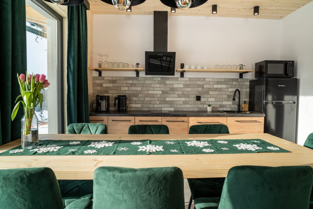 Parter: Witamy Was w przestronnym salonie, gdzie z łatwością odnajdziecie się przy telewizorze, rozkładanej sofie dla 2 osób i stylowym stoliku. Kuchnia na parterze jest w pełni wyposażona, oferując płytę indukcyjną, toster, czajnik, mikrofalówkę, lodówkę, ekspres do kawy oraz pełen zestaw patelni. Taras, dostępny z salonu, z pewnością stanie się Waszym ulubionym miejscem na śniadania przy świeżym górskim powietrzu.