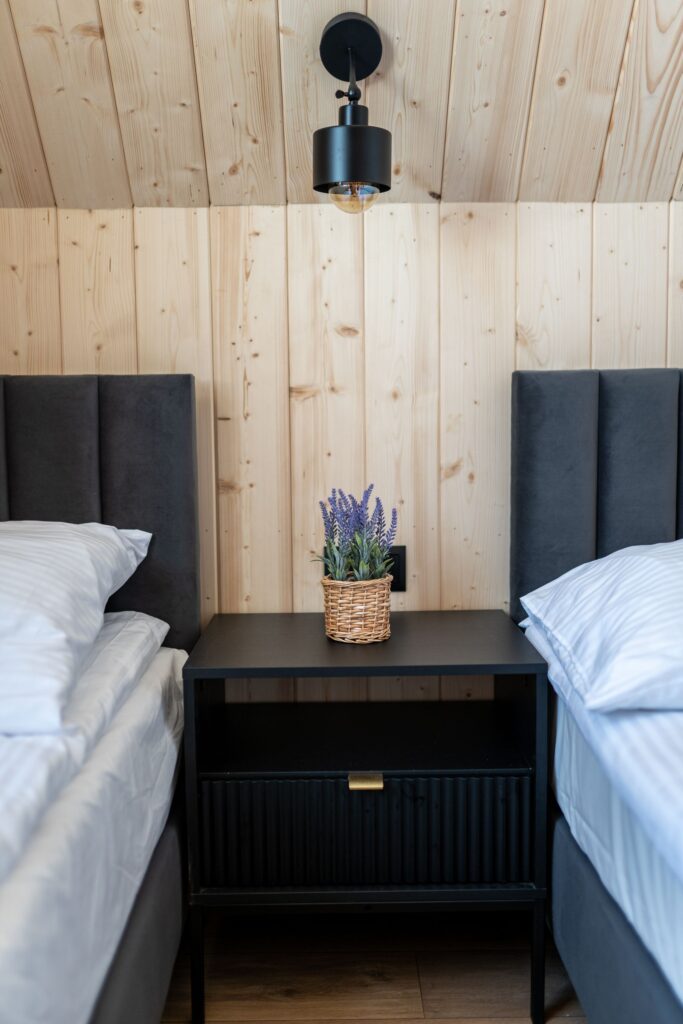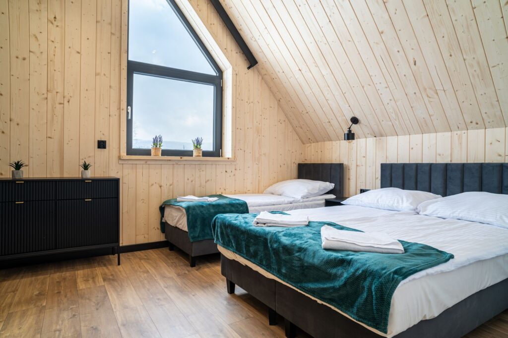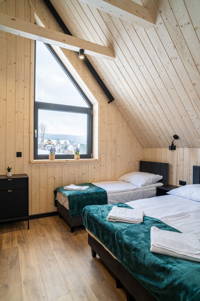 Piętro: Podczas gdy góralski klimat przenika całe wnętrze, na piętrze znajdują się dwie przytulne sypialnie. Pierwsza z nich oferuje 2-osobowe łóżko, natomiast druga – idealna dla większej grupy – posiada 4 wygodne miejsca do snu. Druga łazienka na piętrze z prysznicem oraz suszarką do włosów ułatwi Wam codzienne przygotowania.